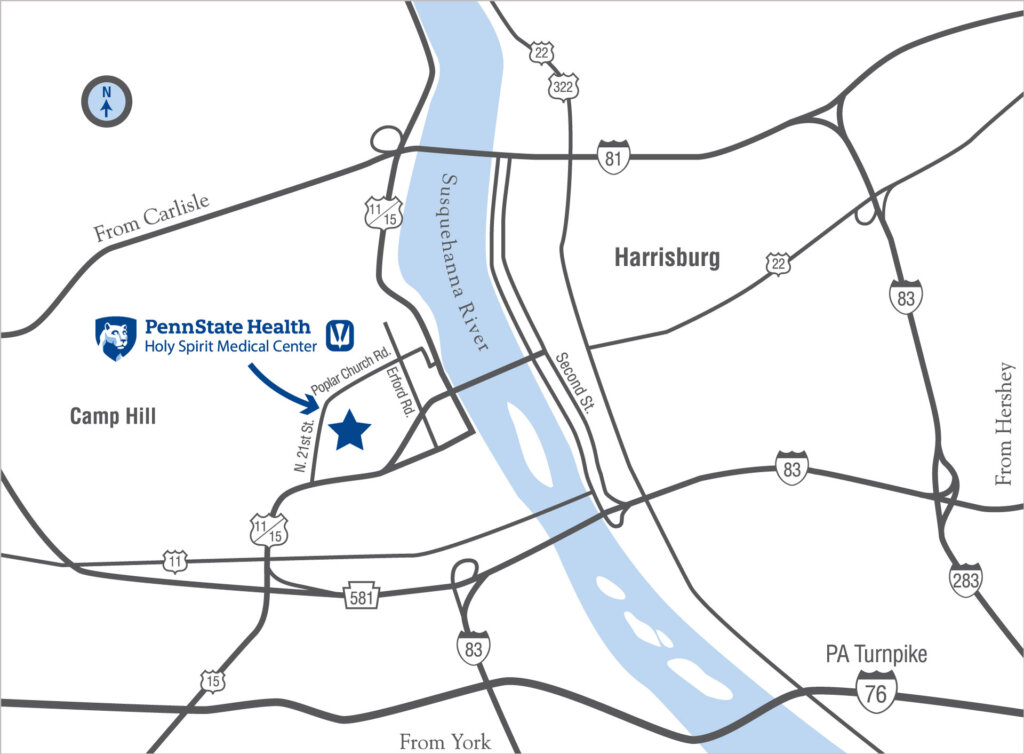 Take I-83 N to exit 41A to merge onto PA-581 W toward I-81 S Camp Hill. Use the right lane to take exit 5B-A for US 11 N/US 15 N toward Camp Hill. Merge onto US 11 N/S 32nd St./US Hwy 15/501 N. Use the far left lane to turn left onto N. 21st St. Turn right into Holy Spirit Medical Center parking lot.